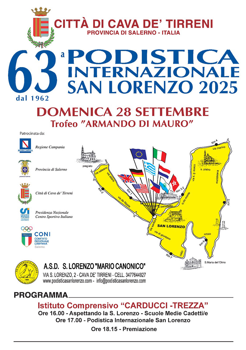 Giovedì 25 settembre 2025, alle ore 10.00, presso l’Aula Consiliare “Sabato Martelli Castaldi” del Palazzo di Città di Cava de’ Tirreni (SA), si terrà la conferenza stampa di presentazione della 63ª edizione della “Podistica Internazionale San Lorenzo” - Trofeo Armando Di Mauro, in programma domenica 28 settembre 2025 a Cava de’ Tirreni con partenza ed arrivo in località San Lorenzo.